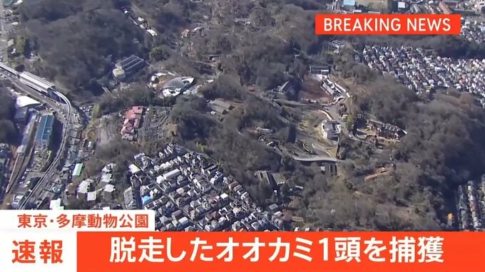 東京・日野市の多摩動物公園で、けさからオオカミ1頭が脱走していましたが、さきほど午後2時半ごろ、捕獲されたということです。多摩動物公園はきょうは臨時休園とし、年内の営業を終えています。
