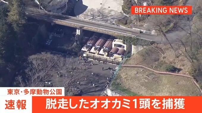 脱走したのは園にいるタイリクオオカミ2頭のうち1頭で、さきほど捕獲を完了したということです。