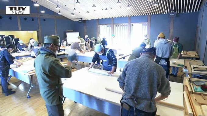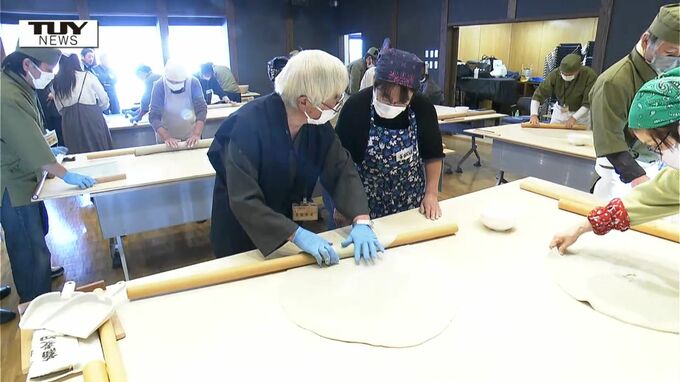 東根市の施設「東の杜」では、年末年始の手作り講座として様々な催しを行っていて、きょうはそば打ち講座。地元のそば打ち名人が指導するとあって大賑わいです。