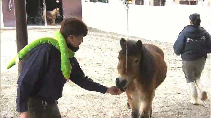 間もなく迎える新年を前に岡山市北区の池田動物園で恒例の干支の引継ぎ式が行われました。午年を前に開かれた干支の引継ぎ式です。今年の干支=へびに扮したスタッフが見守る中、来年の干支である午=ポニーの「モ…