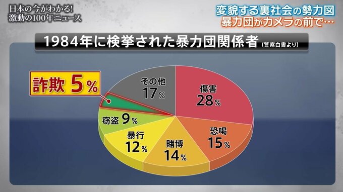 昭和の末期、暴力団による犯罪は傷害、恐喝、賭博が半数以上を占め、詐欺は5%にとどまっています。