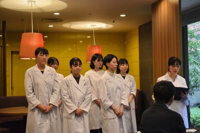 完成に先立ち、メニュー開発に携わった学生たちも参加した試食会も開催されました。学生はホテルの厨房に入り、盛り付けなどの調理補助を体験。自身の提案が実際の料理として提供される様子を見届けました。
