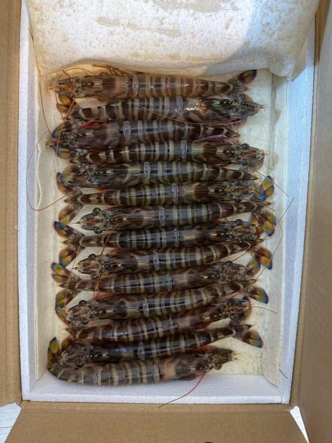 届いた食材の中には、まだ生きている新鮮な車海老も含まれていました。発泡スチロールの箱に整然と並べられた海老の様子からも鮮度の高さがうかがえます。
