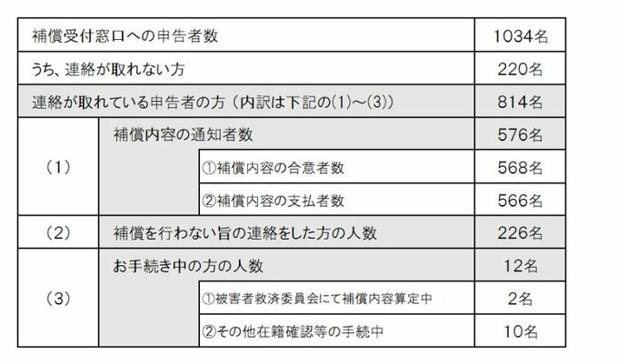 公式サイトでは「被害者救済委員会は被害補償の受付開始後、本日時点までに、合計1034名の方から補償申告をいただいております」「そのうち802名の方について、被害者救済委員会から補償内容を通知(576名)、または、弊社より補償を行わない旨をご連絡(226名)しました」と説明しています。