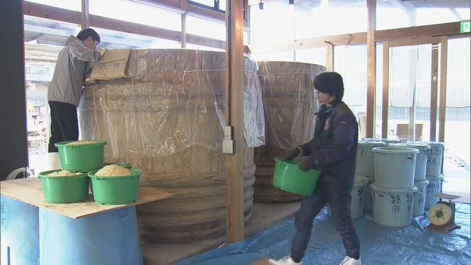 多気町のVISONで行われる漬け込み作業は、ことしで6回目。きょうは今月10日頃から天日干ししたおよそ4000本の御園大根を、生産者らが直径1.8メートル、高さ2メートルの樽に隙間なく、丁寧に敷き詰めていきました。