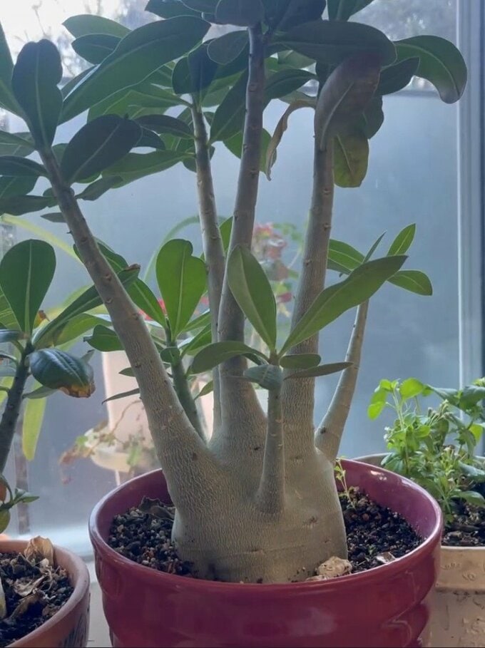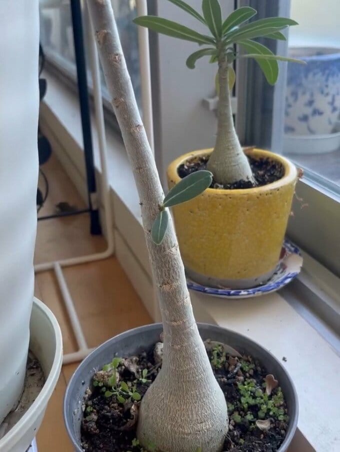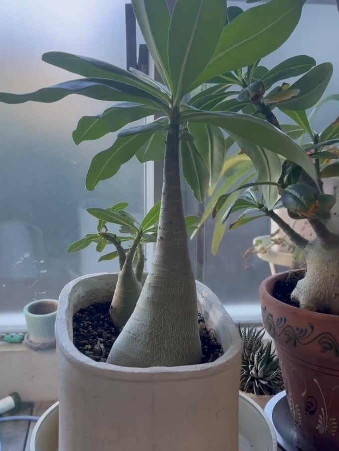 投稿では「前から育てたアデニウム 冬が越せないので部屋の中へ」とコメントし、種から育てたアデニウムが大きく成長した様子を複数の動画で紹介しています。
