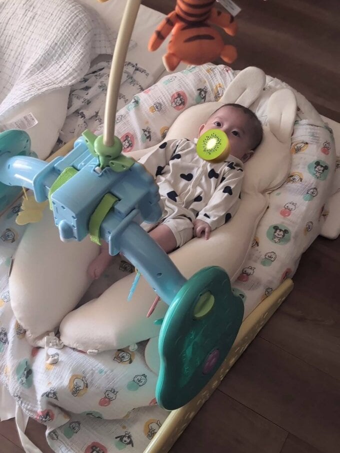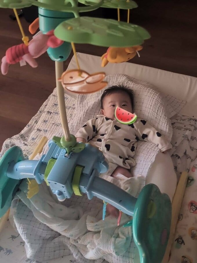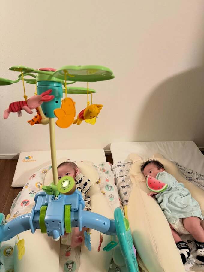 翔子さんは「サンタさんにもらったプーメリー」と、ディズニーの「くまのプーさん」のメリーを使ってみたことを投稿。「ふたごずーっと目でみて足パタパタうれしそう!」「動くもの、たまにプーさんが話しかけてくれたり、うれしそー!」と反応を伝えています。