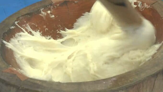 天満屋岡山店で行われた岡山県北・新庄村の特産「ヒメノモチ」を使った餅つきです。「ヒメノモチ」は強い粘りと甘みが特徴でなめらかな舌触りの餅に仕上がるといいます。きょう(29日)は270キロの餅がつかれ、売場には開店直後から長蛇の列ができていました。