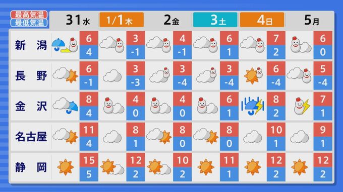 北陸では、31日以降雪や雨の降るところが多い見込みです。上空の寒気も強く、元日などは冷え込みが厳しくなりそうです。