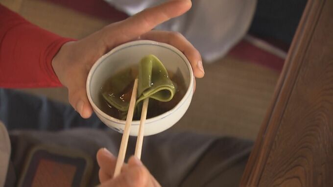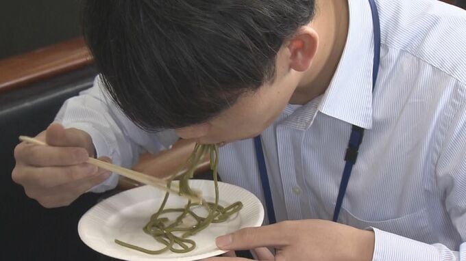 製茶問屋の西海園と香川県の製麺会社の協力を得て作ったそのぎ茶の粉末を練りこんだ「細いうどん」を考案し、役場のメンバーで試食した。