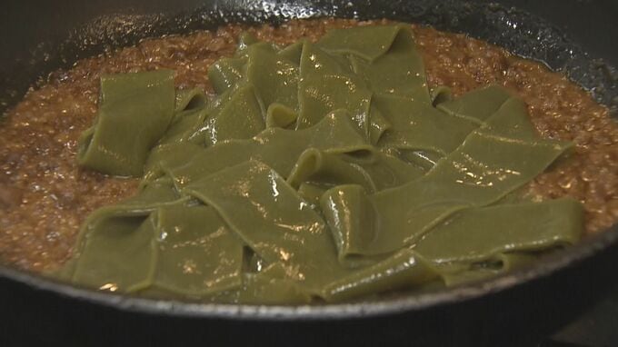 「いいですね。開けた瞬間にふわっとお茶の香りが漂ってきますね。特徴的な。面白いですね平麺。初めて見ました。今回はミートソースで合わせてみようかと」