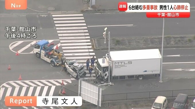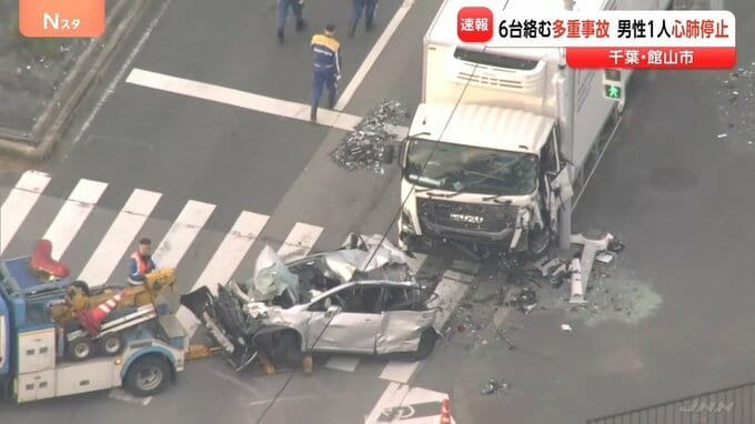 千葉県・館山市でトラックや乗用車など6台が絡む事故があり4人が病院に運ばれ、このうち男性1人が心肺停止の状態となっています。