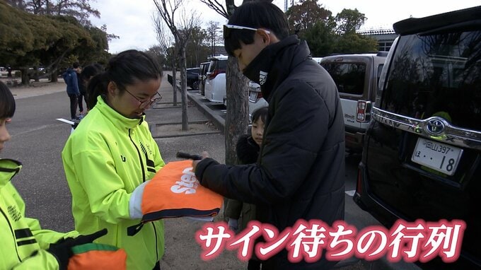 なんと地元の中学校の陸上部員らが列を作り黒田選手にサインを求めていたのだ。求められるがまま、シューズ袋などに笑顔でサインを書く黒田選手。しかし手元を見てみると書かれていたのは楷書で「黒田朝日」。さながら持ち物への“名前書き”のようだった【画像⑤】。