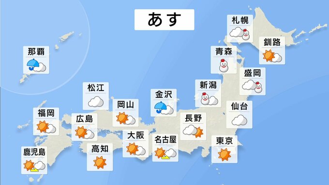 冬型の気圧配置となり、上空には寒気が流れ込むでしょう。北日本の日本海側や北陸の山沿いでは大雪となるおそれがあります。関東から九州は太平洋側を中心に晴れるでしょう。気温です。最低気温はけさと同じくらい…