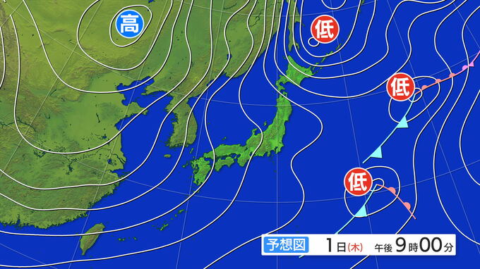 【画像①】はあす(1日)午前9時の予想天気図です。
