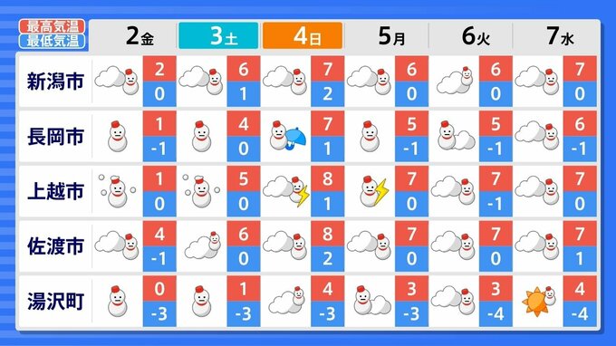 今後の週間天気予報や雨と雪のシミュレーションを見ると、新潟県内は雨や雪が降りやすい状態がしばらく続きそうです。二年参りや初詣は、暖かくしてお出かけください。