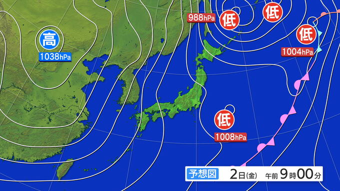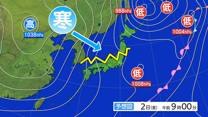 2日(金)予想天気図で本州付近の「等圧線の膨らみ」に注目すると、これは北からの「寒気」と西回りで流れ込む「風」がぶつかり地点です。