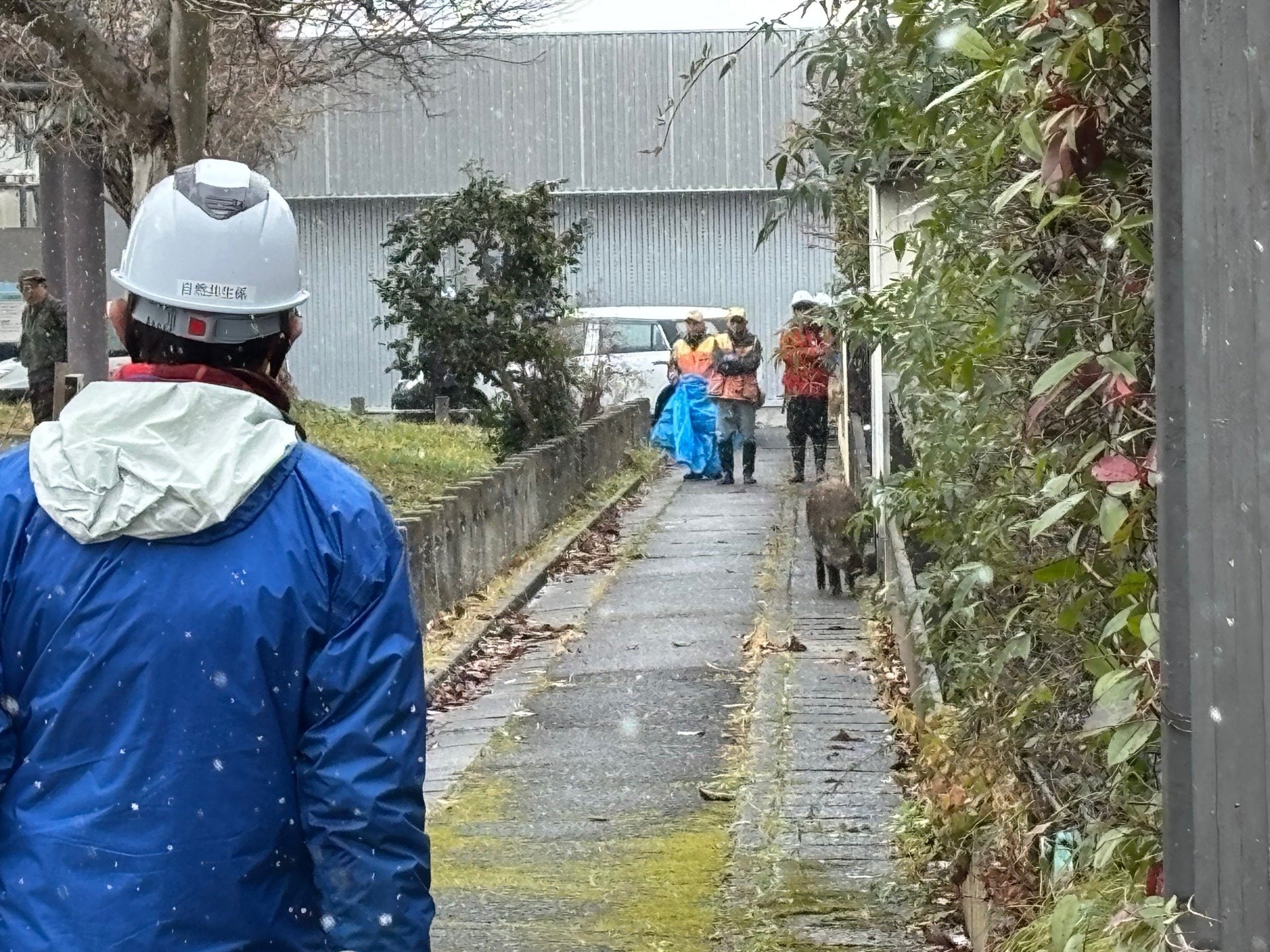 公園の中を悠然と歩くイノシシ。その周りを警察官や猟友会が取り囲んでいます。