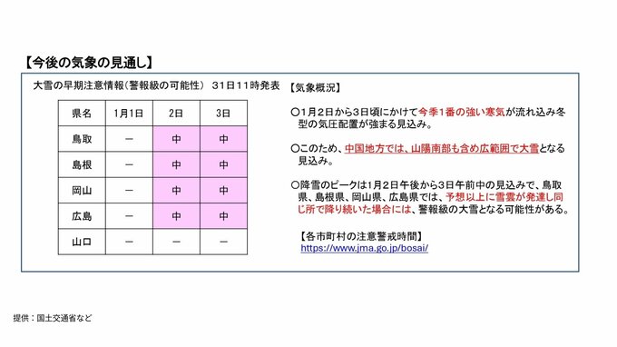【ノーマルタイヤは危険!】国交省「大雪時の外出を控えて」中国地方で大雪のおそれ 1月2日(金)〜3日(土)にかけて 注意呼びかけ RSK山陽放送 2025年12月31日(水) 16:28 国内 降雪のピークはいつ? 【画像①】 降雪のピークは1月2日午後から3日午前中と予想【画像①】されており、鳥取県、島根県、岡山県、広島県では、予想以上に雪雲が発達し同じ場所で降り続いた場合には、警報級の大雪となる可能性があるとのことです。