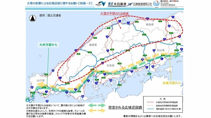 年末年始で帰省や観光で山陰方面に向かう人については、行程の前倒しや延期の検討を求めています。また、近畿方面から山陰方面及び九州方面から近畿方面に向かう方は、最新の情報をもとに山陽側への広域迂回を検討するよう呼びかけています【画像②】。