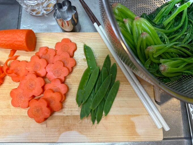 まな板の上には花形に抜かれた鮮やかなオレンジ色のニンジンが並び、緑のサヤエンドウと対照的な色合いを見せています。