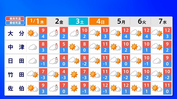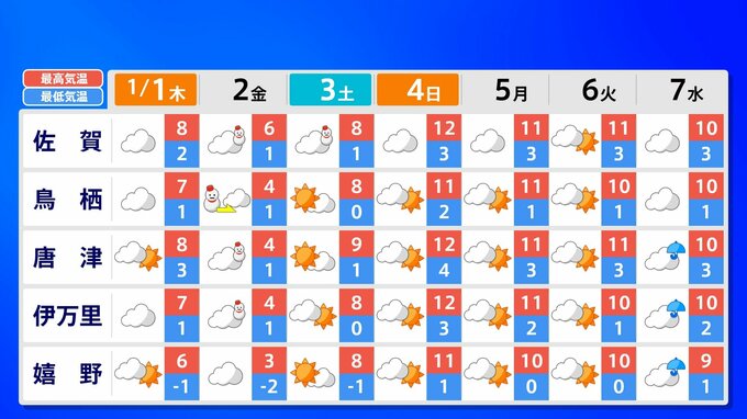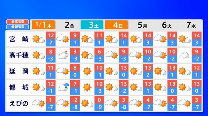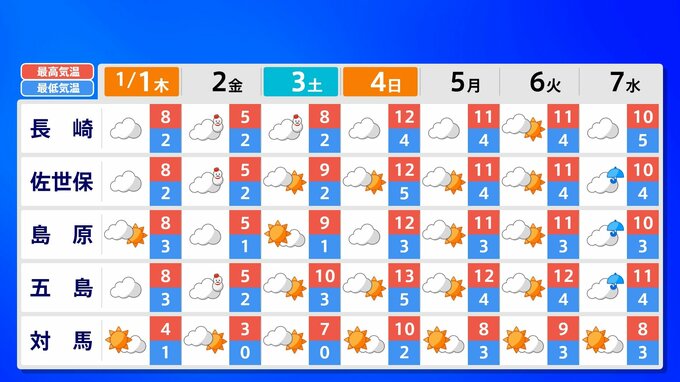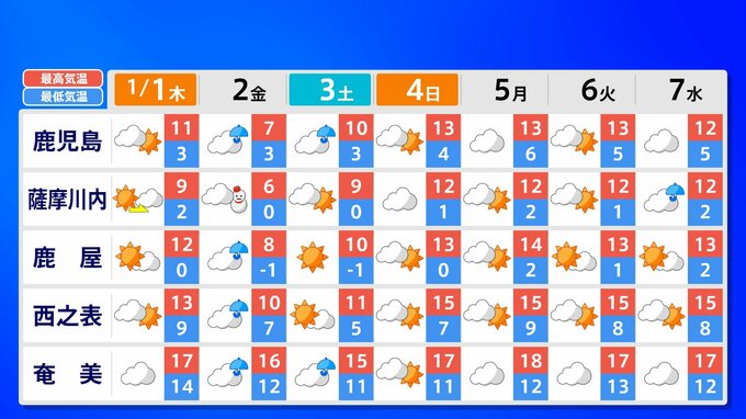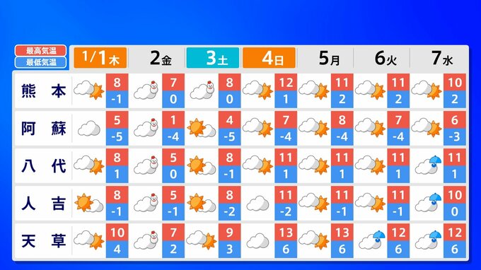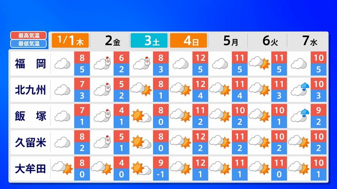 【大雪情報】新春寒波 福岡12cm 熊本10cm「正月に積雪のおそれ」【雪シミュレーション 1月2日(金)~3日(土)/ 九州各都市の新年の週間予報】福岡・佐賀・長崎・大分・熊本・宮崎・鹿児島 南日本放送 2025年12月31日(水) 17:35 国内 天気 九州地方各都市の新年の週間予報(元日 ~ 7日(水)) 各都道府県の週間予報(1月7日(水)まで)を画像で掲載しています(各県5か所ずつ)。 2026年のお正月は雪だけでなく、寒波がやってきてかなり寒くなりそうです。 この記事をはじめから読む(リンク)→「大雪情報」 福岡12cm 熊本10cm「正月に積雪のおそれ」【雪シミュレーション 1月2日(金)~3日(土)/ 九州各都市の新年の週間予報】