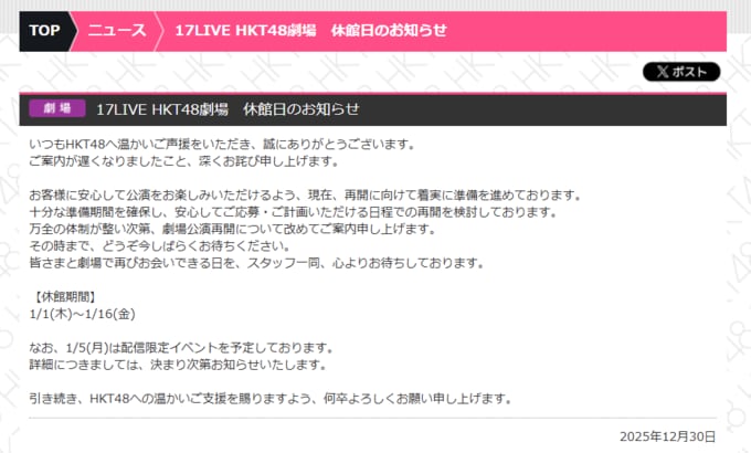 公式サイトでは、【17LIVE HKT48劇場 休館日のお知らせ】と題し、「いつもHKT48へ温かいご声援をいただき、誠にありがとうございます。ご案内が遅くなりましたこと、深くお詫び申し上げます」と、ファンへ向けて、感謝と謝罪から始まっています。