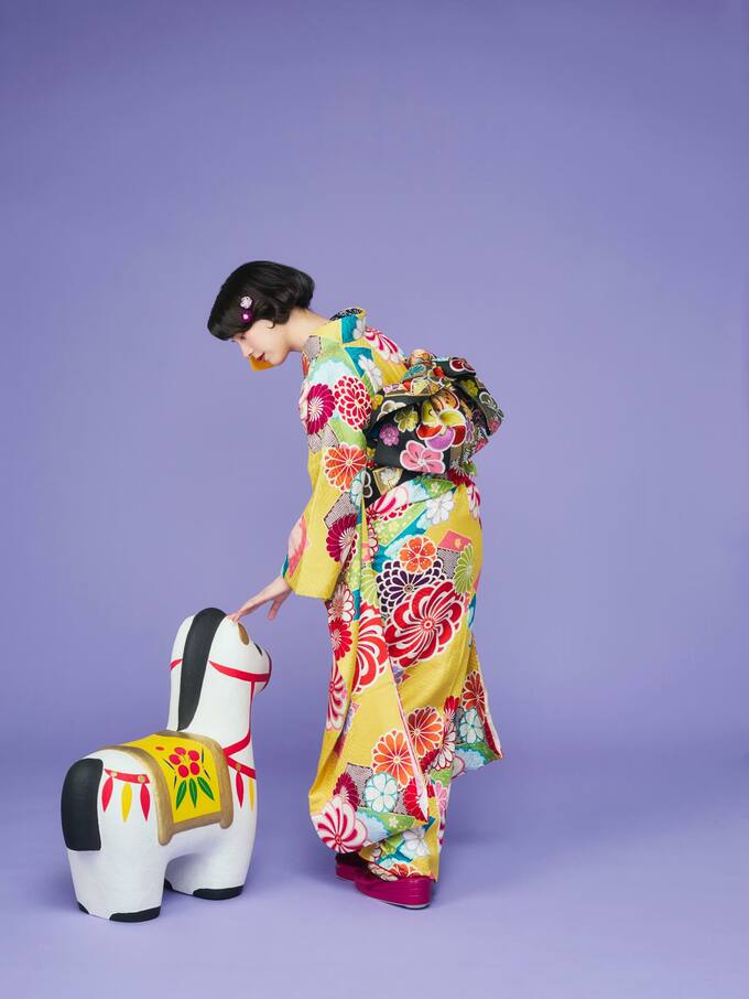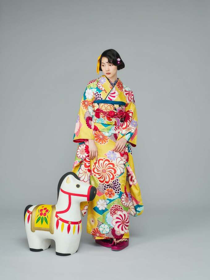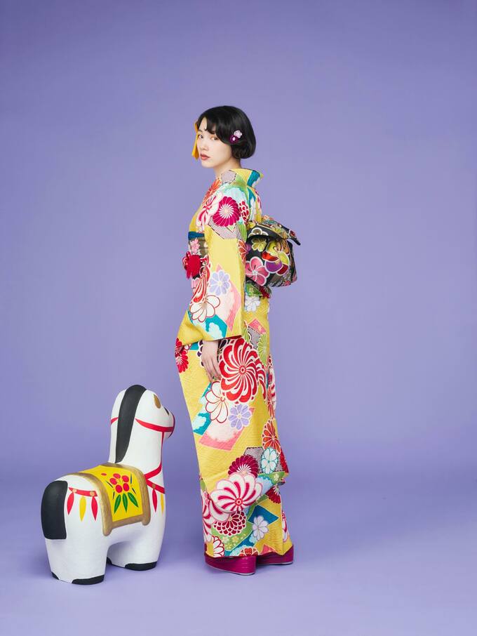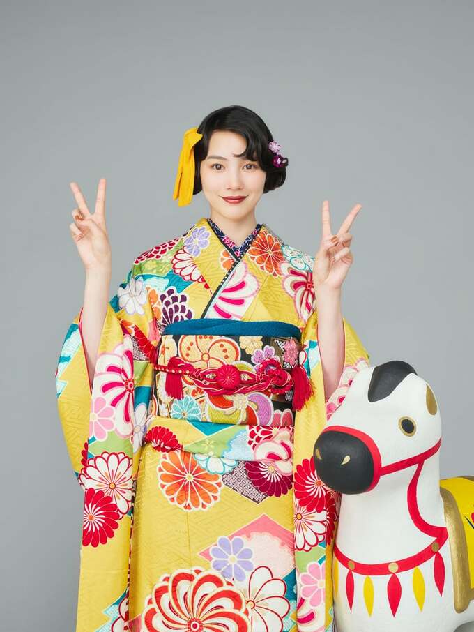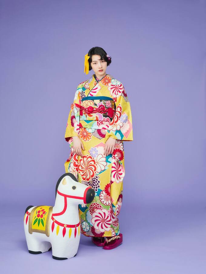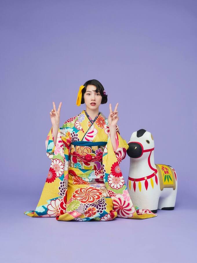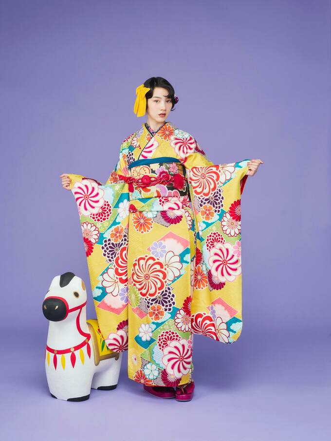 のんさんは黄色地に赤やピンク、青、緑の大きな花模様が散りばめられた振袖を着て様々なポーズの写真を披露しています。