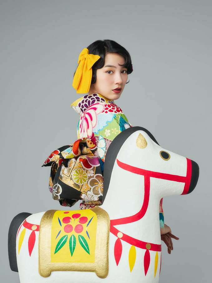 写真の中でのんさんは両手でピースサインを作ったり、袖を広げたり、また馬の置物に触れるなど、様々な仕草を見せています。