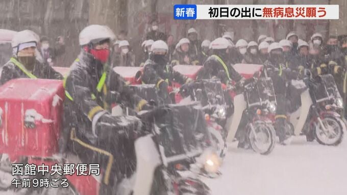一方、函館中央郵便局で行われたのは、年賀状配達の出発式です。