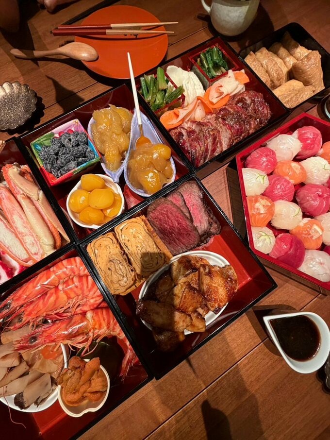 投稿されたおせち料理は、色鮮やかな握り寿司や刺身などが美しく盛り付けられ、木製のテーブル上に整然と並べられています。