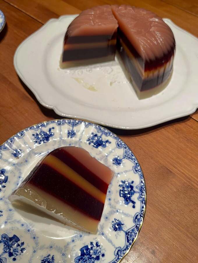 また、三色の層状のゼリーのようなデザートの写真も添えられています。青花柄の陶器皿に切り分けて、テーブルの上に美しく配置されていました。