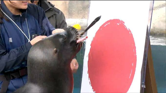 仙台市宮城野区にある仙台うみの杜水族館では、新春恒例となっているオタリアによる書初めが披露されました。