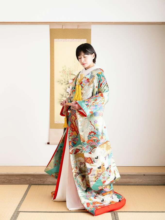 インスタグラムには南沢さんの華やかな着物姿の写真が添えられています。着物は、淡い緑色を基調に、色とりどりの花鳥模様が施され、伝統的な和の美しさを際立たせています。