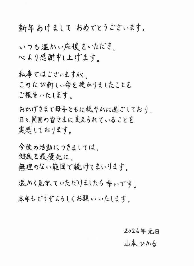 山本さんは、自身のSNSに直筆のメッセージを投稿。「私事ではございますが、 このたび新しい命を授かりましたことをご報告いたします。」「おかげさまで母子ともに穏やかに過ごしており。 日々、周囲の皆さまに支えられていることを実感しております。」と新たな命を授かった喜びを報告しました。