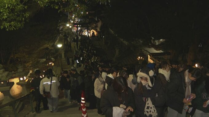 学問の神様、菅原道真公をまつる防府天満宮。31日の午後11時半には、すでにこの行列です。楼門が開くと多くの人が一斉に境内に入り、カウントダウンで盛り上がります。