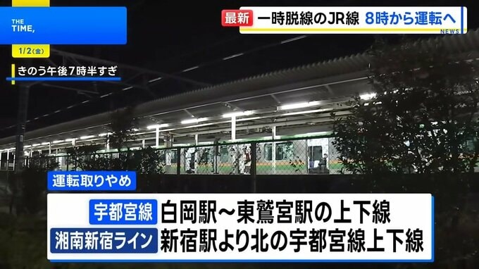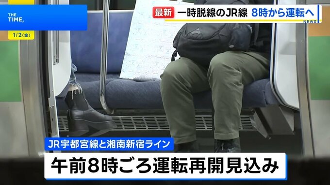 JR東日本によりますと、JR宇都宮線と湘南新宿ラインは、一部の区間で上下線の運転の取り止めが続いていますが、午前8時ごろの運転再開を見込んでいるということです。