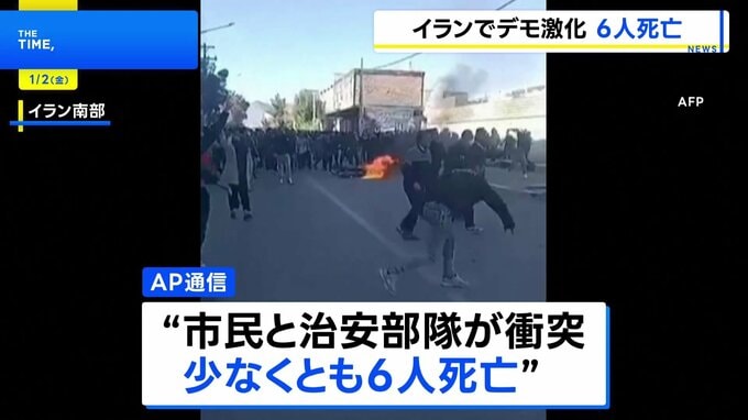 イラン各地で物価高や通貨の暴落に抗議するデモが激化し、デモの参加者と治安部隊の衝突で、これまでに少なくとも6人が死亡したとAP通信が報じました。AP通信は1日当局者の話として、物価高や通貨の暴落に抗議する…