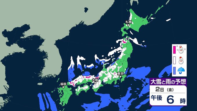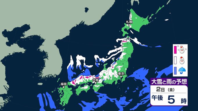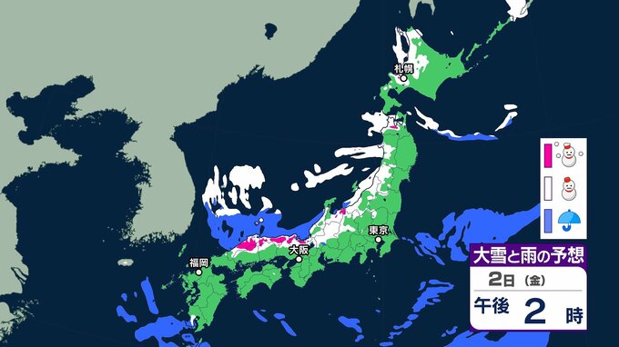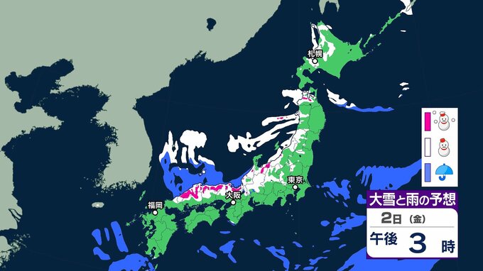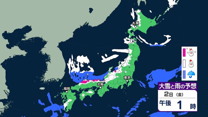【大雪情報】北陸地方で70センチ・近畿地方で60センチの降雪予報も(多いところで)九州北部地方では3日にかけて交通障害に警戒を[全国の雪のシミュレーションを見る(1時間ごと)]気象庁発表 テレビ山口 2026年1月2日(金) 08:29 国内 ~2日午後6時までの雪のシミュレーション(全国・1時間ごと)