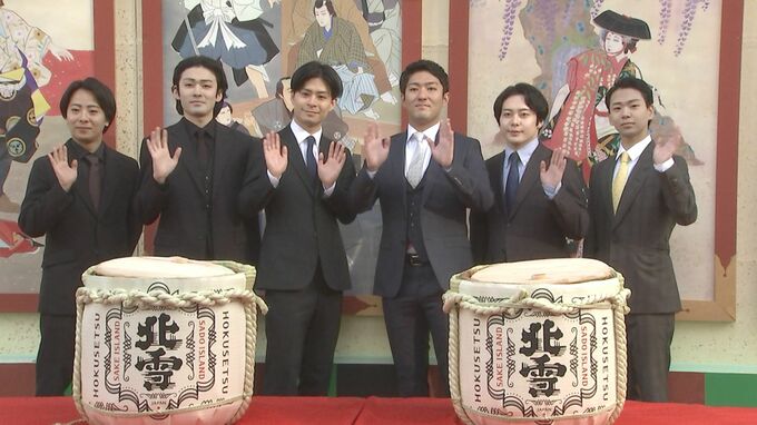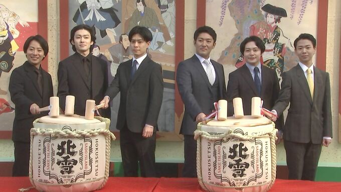 歌舞伎役者の中村橋之助さん、市川男寅さん、中村莟玉さん、市川染五郎さん、尾上左近さん、中村鶴松さんが、「新春浅草歌舞伎」鏡開きに登壇しました。
