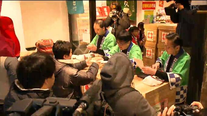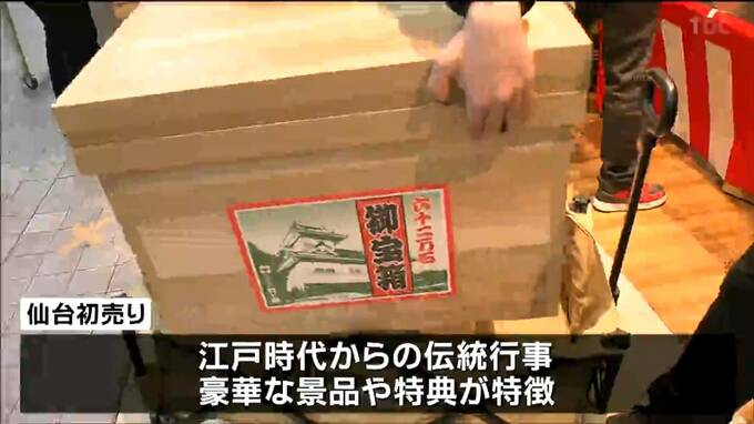 江戸時代から伝わる「仙台初売り」は豪華な景品や特典が特徴で、さっそくお茶や電気ポットなどが入った茶箱の中身を確認する人の姿もみられました。