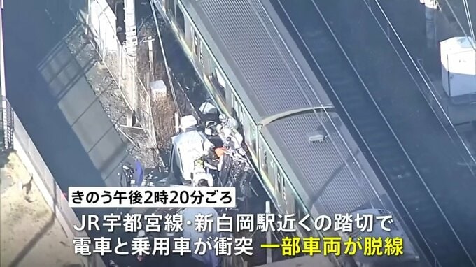 きのう午後2時20分ごろ、埼玉県白岡市のJR宇都宮線・新白岡駅近くの踏切で電車と乗用車が衝突し、電車の一部車両が脱線しました。