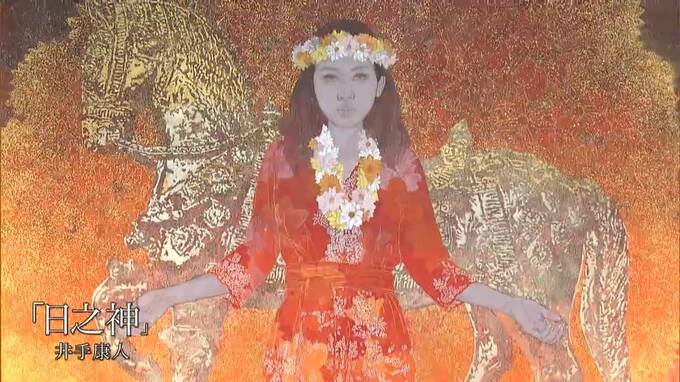 58点が並ぶ会場。瀬戸内市在住の井手康人さんの作品はインドネシア、バリ島の神話をテーマに描かれた大作です。