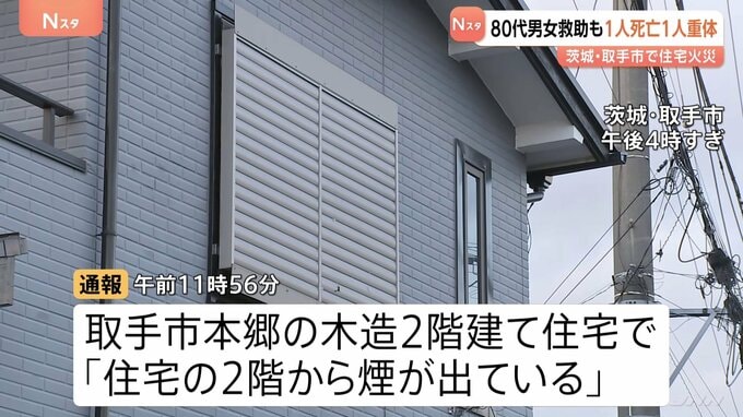きょう正午前、茨城・取手市の住宅で火災があり、夫婦とみられる80代の男女が救助されましたが、男性が死亡し、女性が意識不明の重体です。きょう午前11時56分、茨城県取手市本郷1丁目の木造2階建て住宅で、近くを…