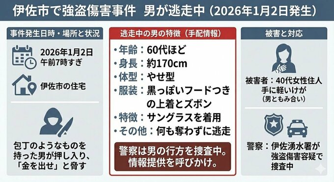 「金を出せ」住宅に包丁男が押し入り女性けが サングラス姿の男は逃走中…強盗傷害容疑で警察が捜査 鹿児島・伊佐市 南日本放送 2026年1月3日(土) 12:16 国内 サングラス姿の男は逃走中 男は年齢60代ほど、身長170センチくらいのやせ型で、黒っぽいフードつきの上着とズボンに、サングラスをかけていたということです。 警察は強盗傷害の疑いで男の行方を追っています。