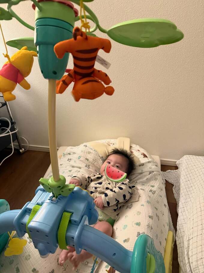 翔子さんは「プーメリーすごい」と題して絵日記を投稿。夜中・昼にぐずることが多くなった双子にメリーを勧める方が多かったようで「サンタさんがくれたのですが」と、「くまのプーさん」が組み込まれた、天井から下がって回るメリーを紹介。