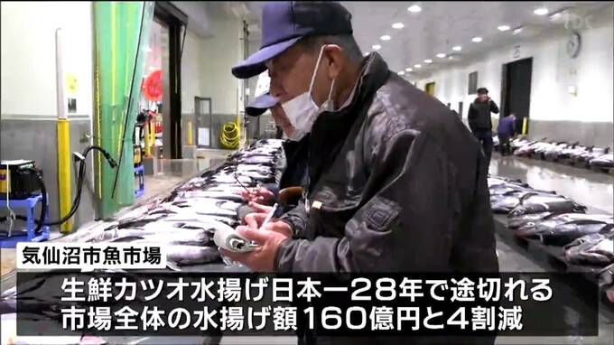 気仙沼市魚市場では2025年、生鮮カツオの水揚げ日本一が28年で途切れ、市場全体の水揚げ額も160億円と前年に比べ4割減りました。