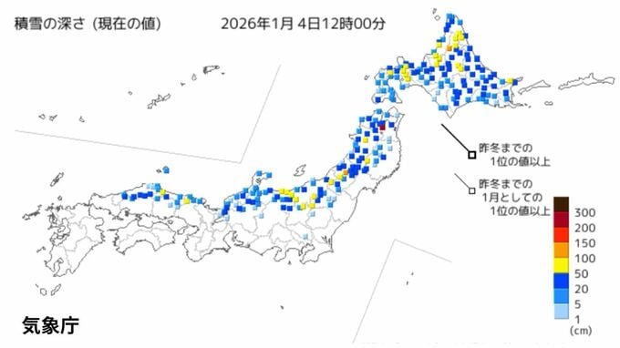 【新春寒波】各地の積雪量は?青森県酸ケ湯(スカユ)は239cm【気象庁 4日正午の積雪量 雪雨シミュレーション】 RSK山陽放送 2026年1月4日(日) 14:06 国内 各地の積雪量は? きょう(4日)正午現在の各地の積雪量です。【画像①】 【画像①】