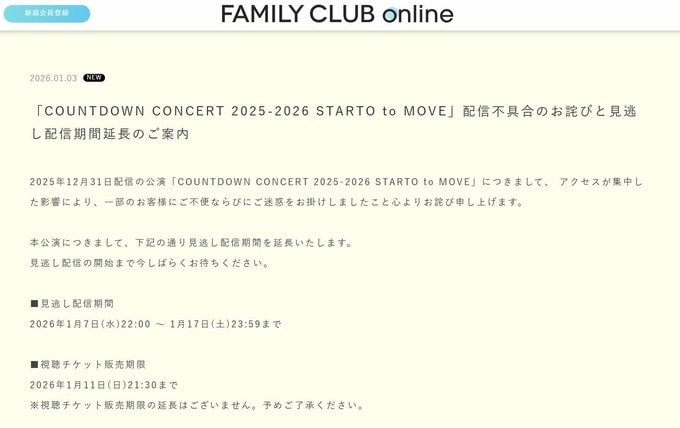 STARTO ENTERTAINMENT社が運営する、「FAMILY CLUB online」の公式サイトが更新され、「『COUNTDOWN CONCERT 2025-2026 STARTO to MOVE』 配信不具合のお詫びと見逃し配信期間延長のご案内」と、題した文書を公表しました。