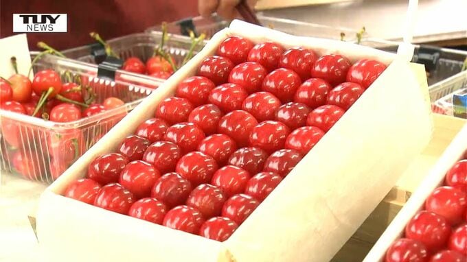 全国各地の卸売市場で初競りが行われるのを前に、山形県天童市の園地ではきょう、超促成栽培で作られたさくらんぼの出荷作業が行われました。こちらは、あすの初競りにかけられる2Lサイズの佐藤錦です。天童市の花…